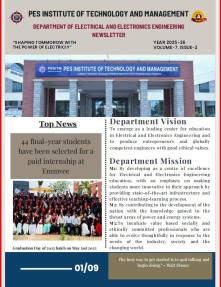The Department has been offering a B.E. program in Electrical & Electronics Engineering since 2007, with an intake of 60 students. The B.E. degree course in Electrical and Electronics Engineering at PESITM, Shivamogga, provides students with a robust foundation in the physical and mathematical sciences related to electrical machinery, power systems, and computational methods. The field of Electrical and Electronics Engineering involves the study and practical application of electricity, electronics, and electromagnetism. It has led to significant inventions, spanning from the radio and television to laser technology and fibre optics.
