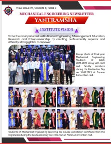 Mechanical Engineering (ME) is an incredibly diverse field that offers captivating and demanding opportunities across every facet of modern technology. Our journey began in 2010 when we initiated our undergraduate program with an intake of 60 students. Since then, we have been committed to nurturing young minds and preparing them for a fulfilling career in mechanical engineering. In 2017, we achieved another significant milestone by establishing a VTU-recognized Research Centre. This centre has become a hub of innovation, attracting numerous research scholars who are actively pursuing their PhD degrees. Research is at the core part we focus on. Our faculty actively participates in various sponsored projects funded by prestigious organisations such as AICTE, VTU, VGST, KSCST, and more.We also make a difference in rural areas through conducting impactful Rural Development Activities to create positive change and improve the quality of life in these communities.